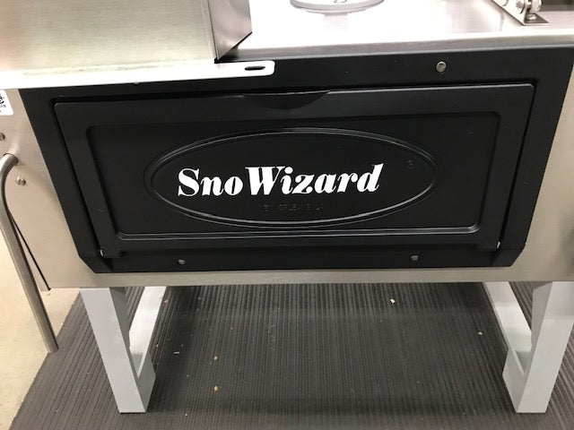 The SnoWizard® Block Ice Shaver in black is built for operators who want true New Orleans–style snow cones with a smooth, fluffy texture that only a real block‑ice machine can produce. Its welded stainless steel body and black powder‑coated front panel create a durable, professional unit designed for steady commercial use in stands, trailers, and busy storefronts. The handwheel and lever system holds the ice block firmly in place, allowing the triple‑blade assembly to shave thin, consistent layers that absorb syrup evenly and keep their shape in the cup.
