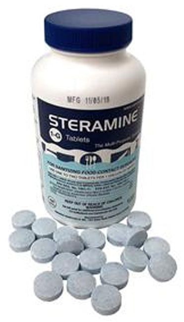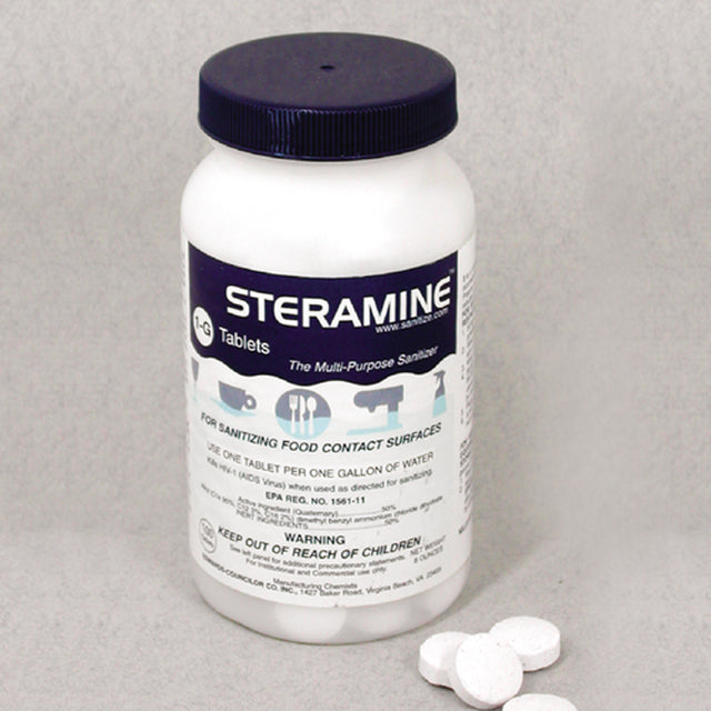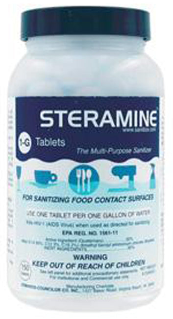 Steramine Tablets, for sanitizing food contact surfaces, use (1) tablet per gallon of water, (150) tablets per bottle, Made in USA