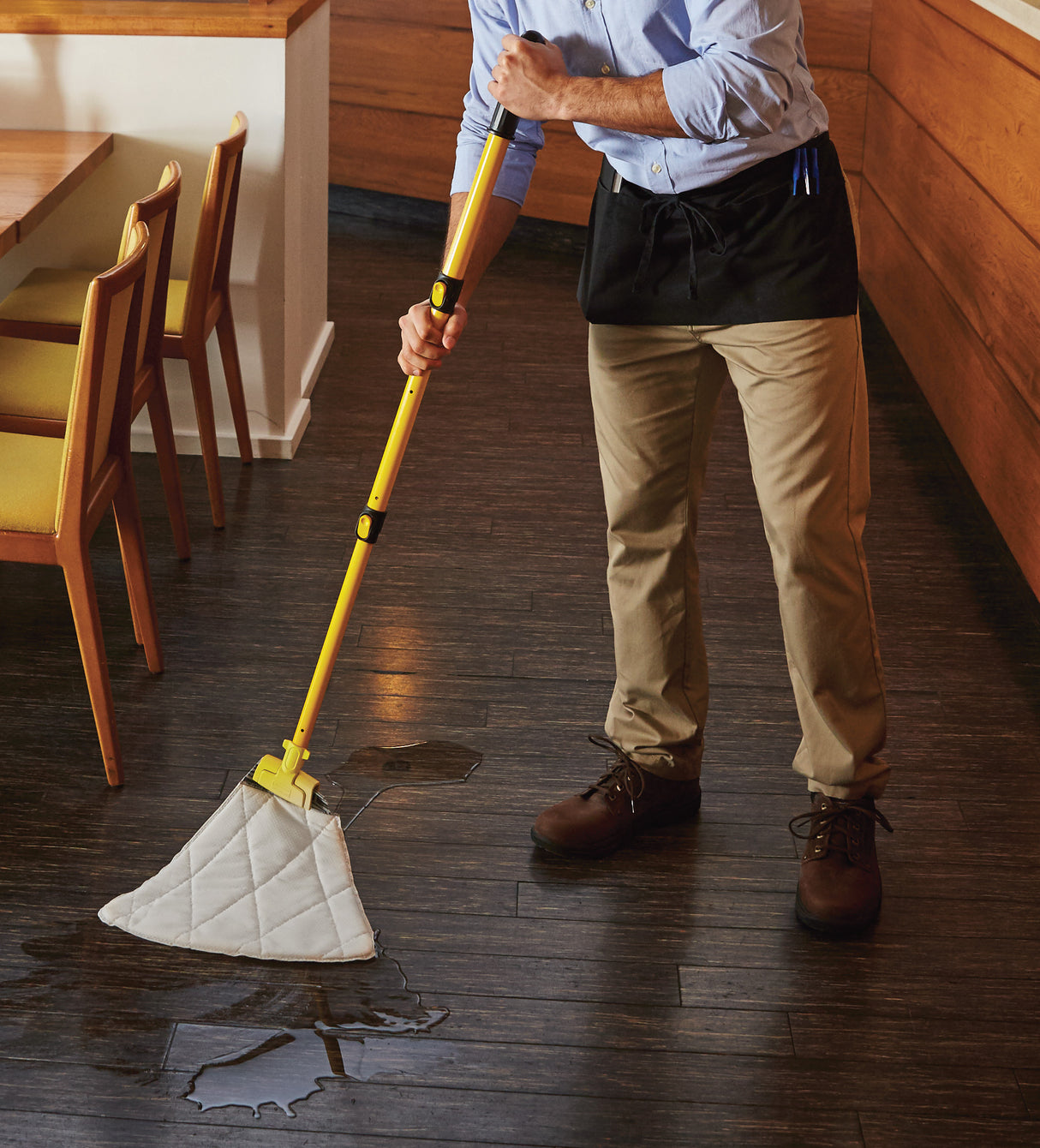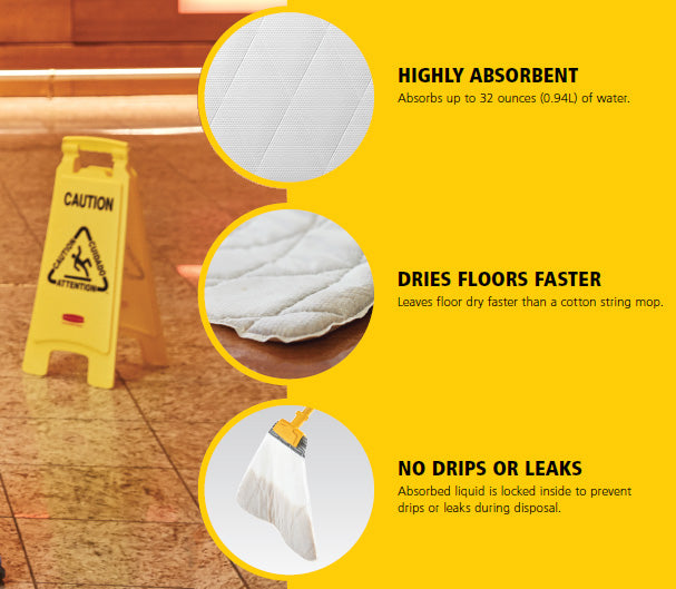 The Rubbermaid Spill Mop Kit helps clean up spills faster which lets the floor dry quicker.