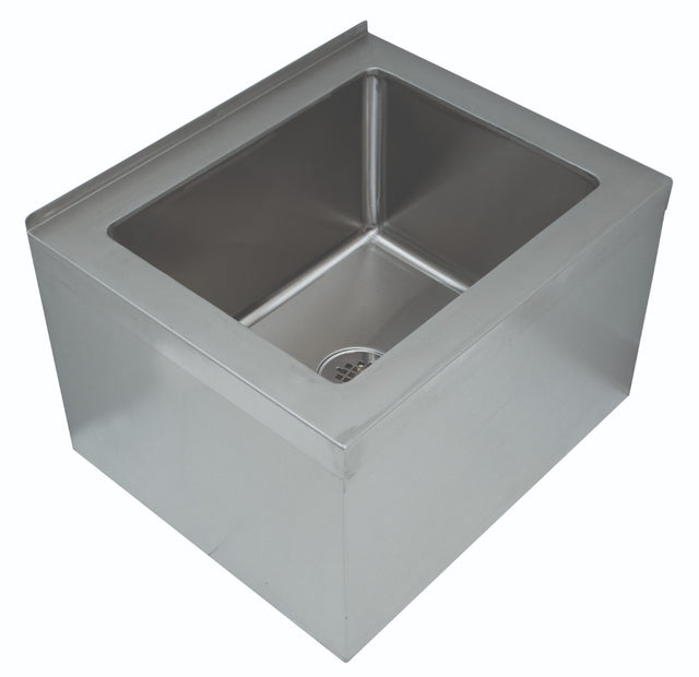 Mop Sink, floor mounted, 25"W x 21"D x 16"H (overall), 20"W x 16" front-to-back x 12" deep (bowl size), free flow drain with 2" IPS outlet, stainless steel construction, NSF