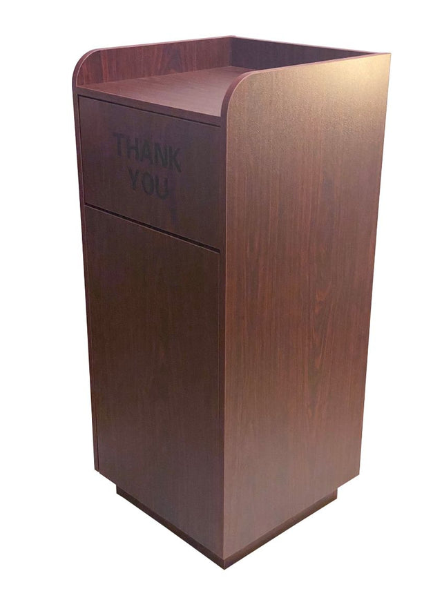 Large capacity trash receptacle with push door. Push door with "Thank You" message. The top is designed for food trays to prevent accidental disposals. The front door allows for easy removal of trash and the floor glides help protect your floors. Constructed of industrial grade compressed wood with a laminate.