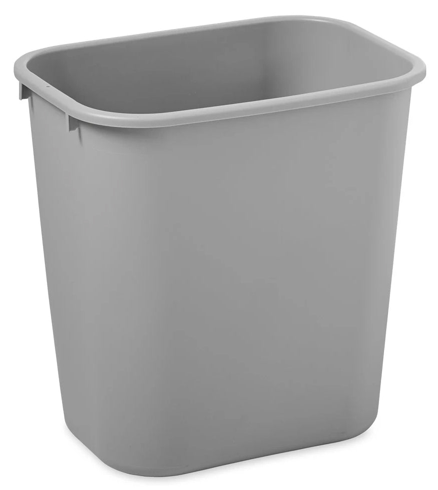 Waste Basket, 28 quart, 14-3/8"W x 10-1/4"D x 15-1/8"H, medium, soft, rolled rims, all plastic, won't chip, rust or dent, gray, Made in USA