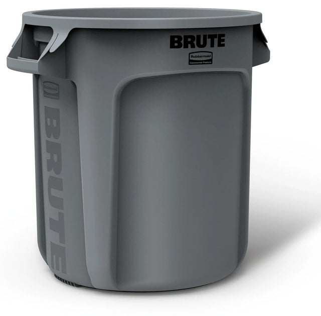 Vented BRUTE Container, without lid, 10 gallon, round, 15-5/8"D x 17-1/7"H, reinforced rims, built in handles, double rimmed base, high-impact plastic construction, gray, NSF, Made in USA