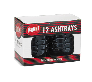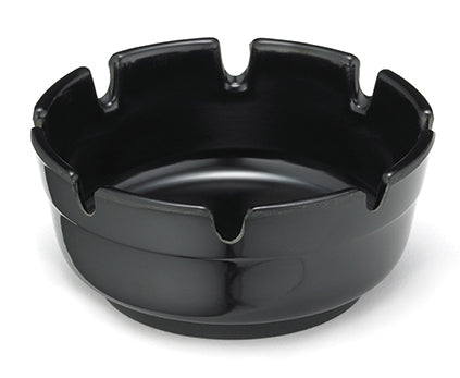 This deepwell ashtray has a 3-7/8" diameter and a 1-3/4" height. It is made of black plastic that will not blister or scorch.
