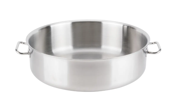 Made of stainless steel with an aluminum- and stainless steel-clad base, the Vollrath 47762 Intrigue® braising pot conducts heat quickly and resists bending or warping from recurrent use. It can produce 18 quarts of short ribs, pot roast, or pork loin in each batch, and the mirror-finish interior doesn't harbor bacteria or sticky residue. Users can lift and carry the pot using two solid loop handles that are welded on for stability.