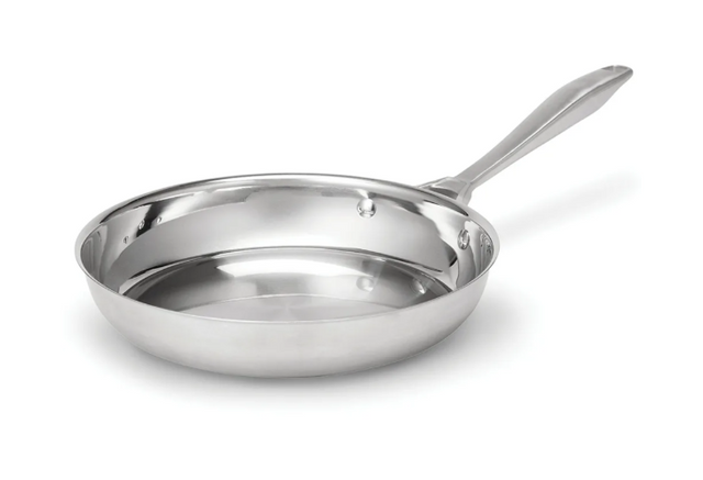 The Vollrath 47752 Intrigue® stainless steel frying pan works well with acidic ingredients such as tomatoes, lemon juice, or vinegar because it doesn't react and leave a metallic taste in the food. Its ergonomic, hollow handle is comfortable to grip and reduces heat transfer to the user's hand. The stainless steel- and aluminum-clad bottom spreads heat evenly, resists warping, and doesn't harbor stuck-on food residue.