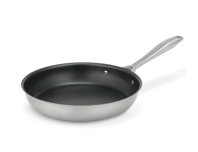 The Vollrath 47756 Intrigue® nonstick steel frying pan can be used to fry, sauté, or brown delicate foods that don't require much oil or butter. It's designed with a sturdy, riveted handle and rounded lip that encourage reliable, mess-free pouring. Heavy-duty stainless steel and aluminum compose the base of the pan, which distributes heat evenly and doesn't warp. Users can safely heat this pan in the oven and place it in the dishwasher for quick cleaning.