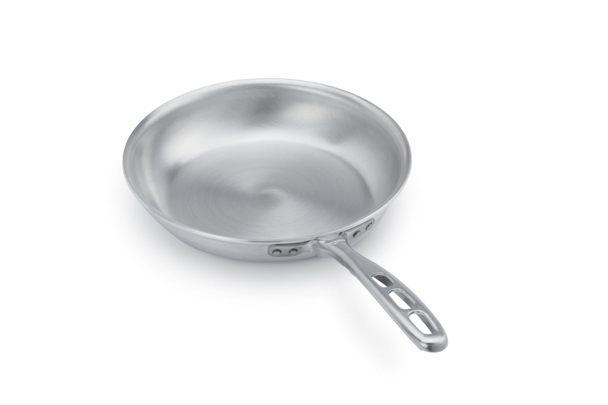 This Wear-Ever Fry Pan from Vollrath is constructed from heavy-duty, impact resistant 3004 aluminum. The TriVent Handle has a unique ergonomic design that reduces stress and fatigue. The vented handle design reduces heat transfer from pan to handle, maximizing operator comfort