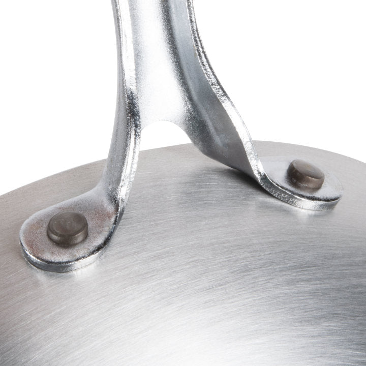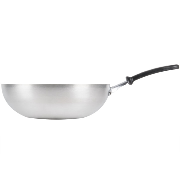 The construction of this stir-fry pan is 3004 aluminum. This type of construction will allow your vegetables, noodles, and proteins for your stir-fry to all cook evenly. The flat bottom of this pan will sit level on the cooking surface.