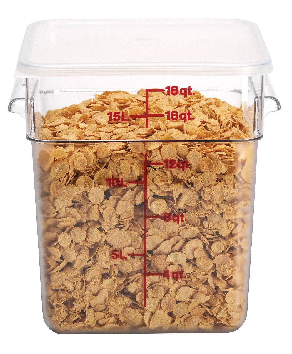 This clear, food container holds 18 quarts and constructed of virtually unbreakable polycarbonate that withstands temperatures from -40 to 210 degrees Fahrenheit. It resists stains and odors, and provides inventory-at-a-glance with easy-to ready color graduations on the outside.