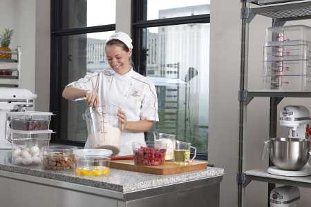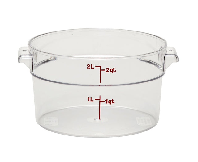 Use this food 2 quart storage container to store ingredients or transport ready-to-serve or partially prepared foods. It has a 8-3/16" diameter and a height of 4-3/16" and constructed of crystal clear, vitally unbreakable Camwear polycarbonate that can withstand temperatures from -40 to 210 degrees Fahrenheit. Its round shape promotes proper air circulation around the container. The easy-to-read imprinted graduations on the outside for inventory at a glance. The molded-in holes in the handles are for quick and sanitary drying.