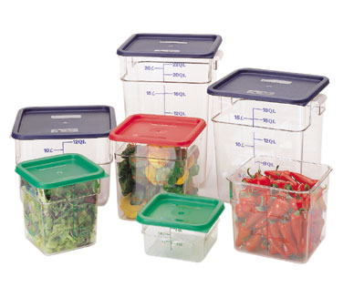 Improperly stored food can become vulnerable to cross contamination and compromised quality. CamSquare Storage Containers are clear and have easy-to-read printed graduations to promote inventory management. Using the proper lid, you can completely enclose contents to reduce the risk cross-contamination. These square shaped containers can be easily stacked, great for maximizing storage space on any shelf. CamSquare Storage Containers can be used with Translucent Seal Lids or with Color-coded snap tight polyethylene covers to match graduation colors.
