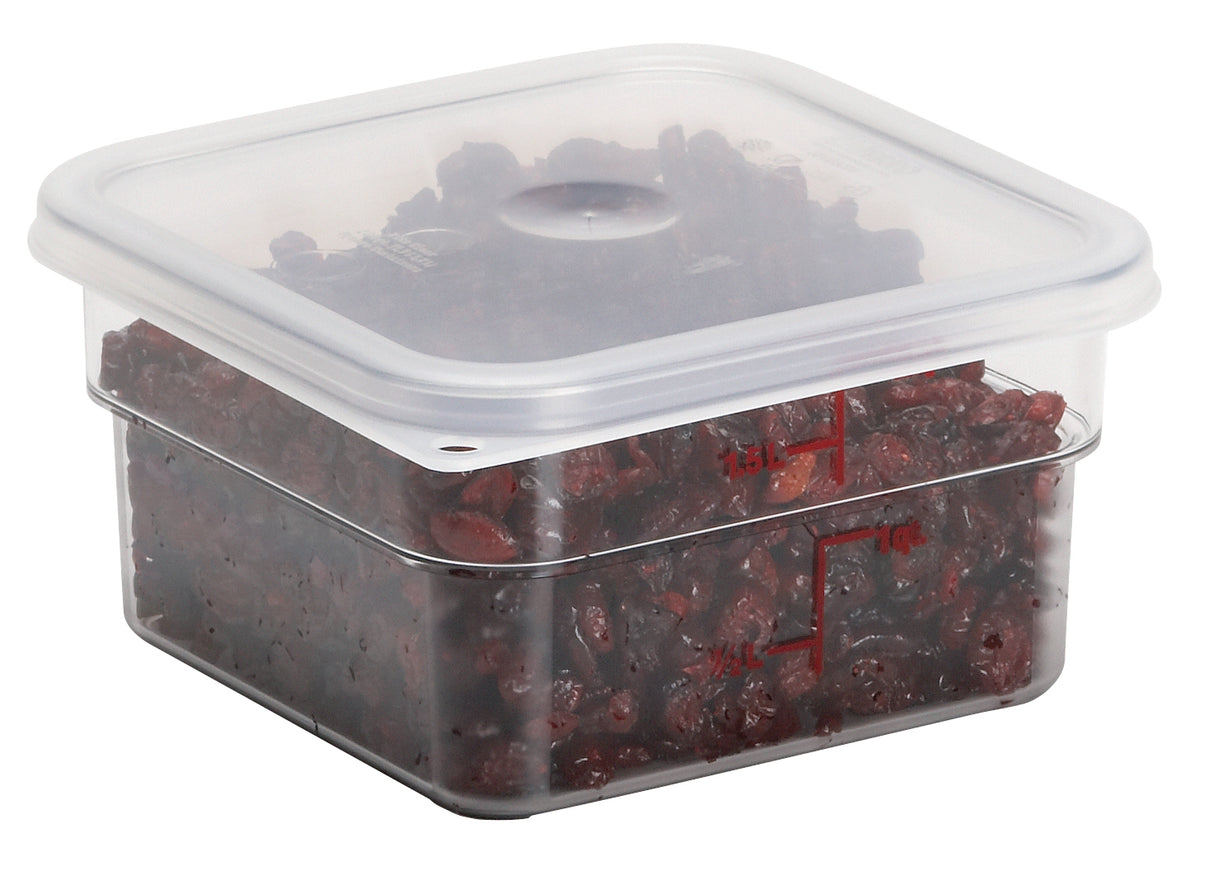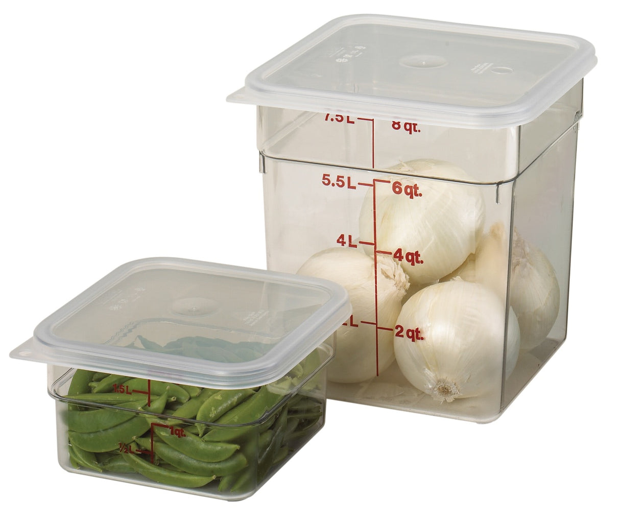 Improperly stored food can become vulnerable to cross contamination and compromised quality. CamSquare Storage Containers are clear and have easy-to-read printed graduations to promote inventory management. Using the proper lid, you can completely enclose contents to reduce the risk cross-contamination. These square shaped containers can be easily stacked, great for maximizing storage space on any shelf. CamSquare Storage Containers can be used with Translucent Seal Lids or with Color-coded snap tight polyethylene covers to match graduation colors.