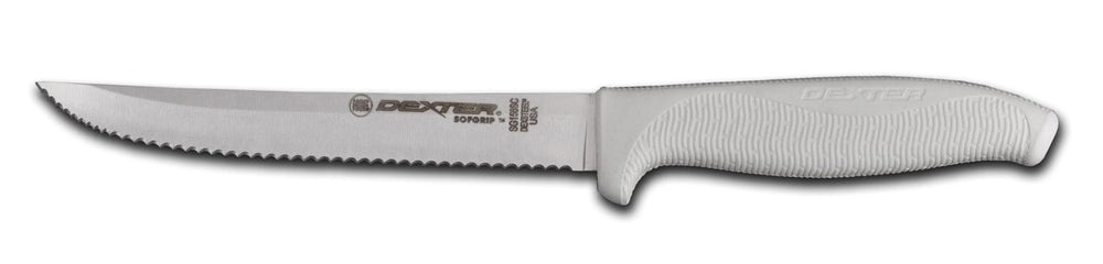 This SofGrip 24213 Utility Slicer Knife has a 6" scalloped edge and is constructed of DEXSTEEL, a stain-free, high-carbon steel blade, with an individually ground and honed edge. It also has a non-slip, white, soft rubber grip handle.The Dexter-Russell Sofgrip brand is the definitive non-slip, stain-free, high-carbon steel professional cutlery. Ergonomically designed knives help to reduce the overdue stress that may lead to carpal tunnel syndrome.