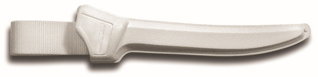 This 20450 Scabbard is the perfect fit for SOFGRIP® and SANI-SAFE® series of fillet knives (from 6” to 9” in length), and Tiger Edge 8” scalloped knives. This scabbard features a riveted strap integral belt loop for safe transport. It has a stitched and riveted white leather body.