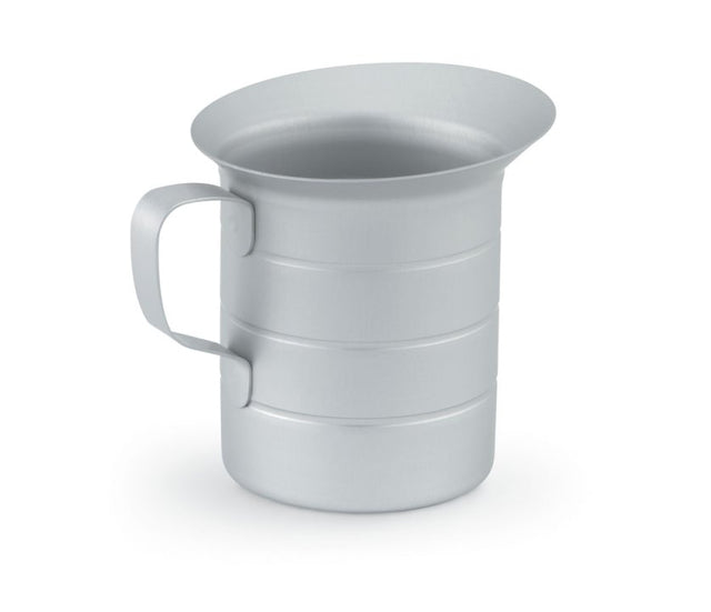 The Vollrath 5350 is an aluminum alloy measurement cup with a capacity of 1 cup. This model features a lipped opening for easy pouring and a welded handle. There are also measurement markings for each 1/4 of capacity. This model is NSF listed and made in America.