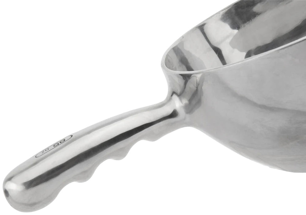 This die-cast aluminum 24 ounce scoop is polished on both the inside and out. It has a grooved finish handle with a finger grip to prevent slipping.