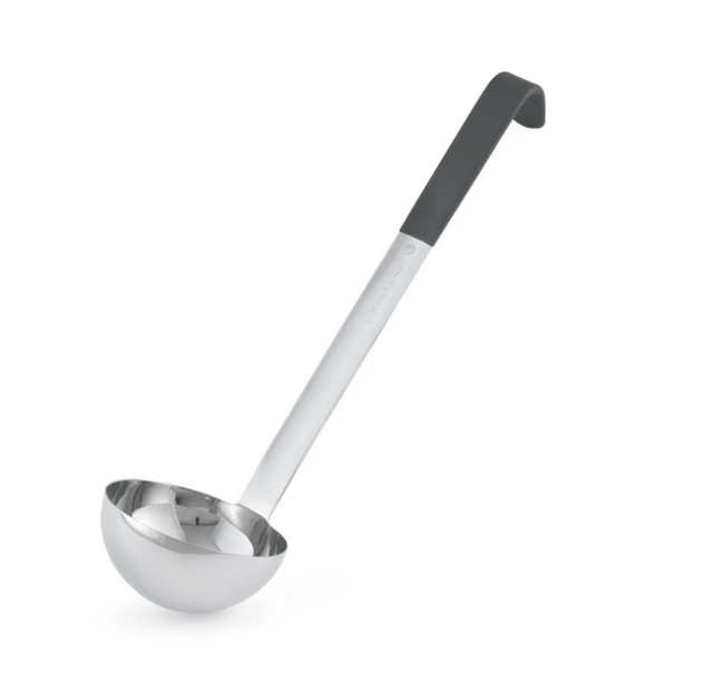Great for soups, sauces, and other liquid products, the Vollrath 4980620 ladle can stir, scoop, portion, and serve. It has a 31⁄2-inch-diameter bowl that holds six ounces, ensuring each scoop is uniform. The handle on the ladle stays cool to the touch, keeping users safe from burns. An antimicrobial agent is integrated into this handle to protect against bacterial growth, and a hook prevents the handle from slipping into the pot.