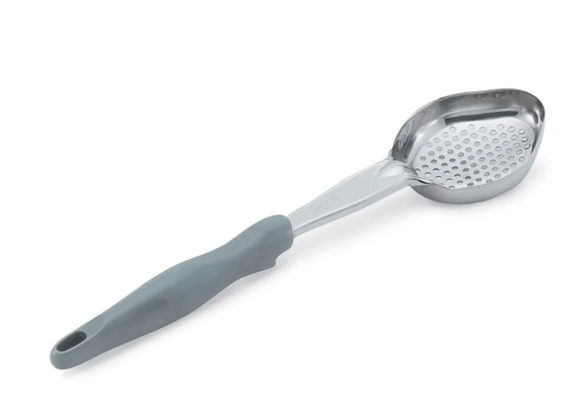 The Vollrath 6422445 Jacob's Pride® Spoodle® portion control spoon's capacity is stamped on its shaft, and its handle comes in gray to indicate its size. This 18/8 stainless steel unit has a 3.68-inch bowl diameter and holds 4 ounces of product, reducing overserving. Perforations line the bowl's bottom, draining unwanted liquid prior to plating. Its one-piece construction provides durability for back-to-back serving, and the nylon handle is comfortable to grip for extended periods of time. Because it's heat resistant to temperatures as high as 450 degrees Fahrenheit, this spoon can be stored on the edge of a hot food pan without melting. Its built-in stopper notch can also secure it in place on a food pan, preventing it from sliding into food. An antimicrobial agent is integrated in the handle to hinder bacterial growth, maintaining a clean handle in between general cleaning. Overall, it has a 13.81-inch length so users can reach into deep food pans.