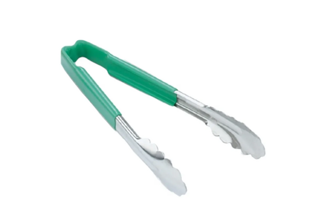 The Vollrath 4790970 VersaGrip® utility tongs have a green plastic-coated handle that fits into HACCP processes to prevent cross contamination. With their flat ends and gripper teeth, these tongs can pick up a variety of products. Made without springs, the utensil’s stainless steel construction is quick cleaning and resists scratches, stains, and rust.