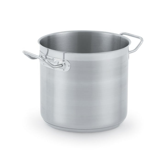 The Optio stockpot by Vollrath is durable, reliable and perfect for the value-conscious chef. The high-quality stainless steel construction resists discoloration and corrosion, promising years of use, and prevents flavor retention for higher-quality results. This pot is induction-ready and features a natural finish and aluminum-clad bottom that ensure even heating and uniform cooking. The tall shape makes this pot ideal for cooking pastas, soups, stews or preparing large quantities of liquids, while the low-domed cover helps retain heat and moisture for more efficient cooking.