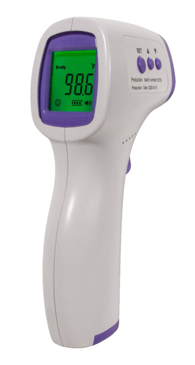 Infrared Forehead Thermometer, non-contact, temperature range: 89.6°F to 109.2°F (32°C to 42.9°C), accuracy: +/- 0.4°F (0.2°C), resolution: 0.1°F/0.1°C, 1-second response, 1-2" testing range, auto shut-off, pre-calibrated, 3-color backlight LCD display, memory storage for last 15 readings, requires (2) AAA batteries (included), white, ISO 13485, CE, FDA approved