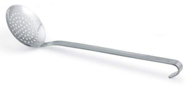 Skim solids from your stews, sauces, soups and more with the stainless steel skimmer by Vollrath. The durable construction promises years of use, and the two-piece design features a strong welded connection. The long handle provides impressive reach, while the hook on the end offers a convenient storage solution. Thanks to the wide blade, it's easy to skim a wide range of food items, making this skimmer a staple in any commercial kitchen.