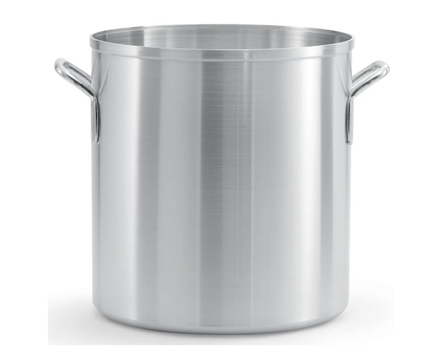 The 40-quart capacity of the Vollrath 67540 Wear-Ever® stock pot is ideal for cooking high volumes of soups, stocks, and stews. It has tall sides and a narrow shape that preserve liquids while food simmers; this also ensures liquids bubble for flavor extraction. Because the pot is made of 8-gauge aluminum, it resists denting and warping. The handles are welded to the sides; this arrangement creates a seamless interior to streamline cleaning.