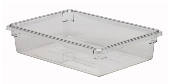 The clear Cambro 18266CW135 Camwear® food storage container provides product visibility for inventory checks. Most of its surfaces are smooth, so the box cleans quickly, and the textured finish on the bottom resists slipping or scratching. Since the container is made of polycarbonate, it can endure heavy use.