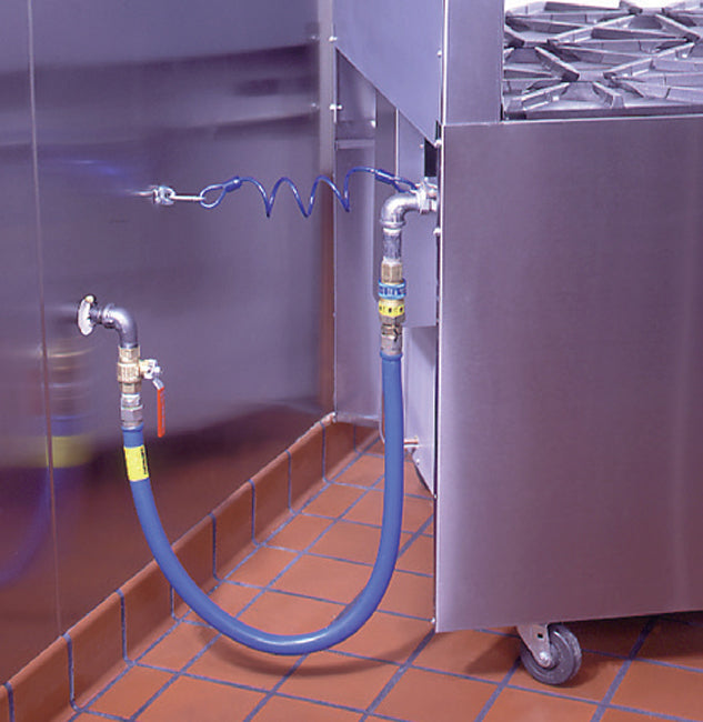 Dormont Blue Hose Moveable Gas Connector Kit, 1-1/4" inside dia., 48" long, covered with stainless steel braid, coated with blue antimicrobial PVC, (1) SnapFast QD, (1) full port valve, (2) 90° elbows, coiled restraining cable with hardware, 541,000 BTU/hr minimum, limited lifetime warranty