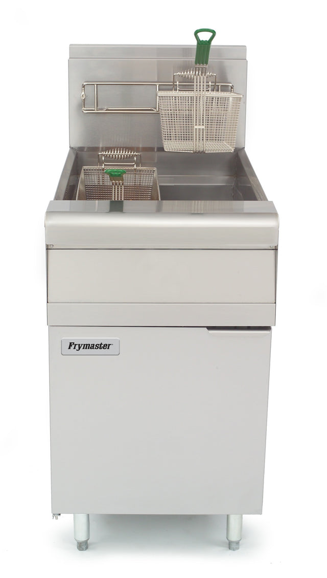 Frymaster® Performance Fryer, gas, floor model, 80 lb. capacity, for chicken & fish, open frypot design, millivolt controller, centerline fast-action temperature probe, thermostat knob on front panel (not available with built-in filtration), includes: rack-type basket support, basket hanger & (2) twin baskets, flue deflector, stainless steel frypot, door & cabinet, 150,000 BTU, CSA Star, CSA Flame, cCSAus, NSF, CE