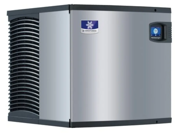 The Manitowoc Ice IDT0420A ice maker can produce 470 pounds of ice in 24 hours. This maximum amount can only be achieved if ambient air and incoming water conditions are at an ideal level. It makes full-cube ice, which is often used for soft drinks and other fountain beverages. This unit uses air to cool the refrigerant, and when it is cold, it removes heat from the evaporator plate so water will freeze and make cubes.