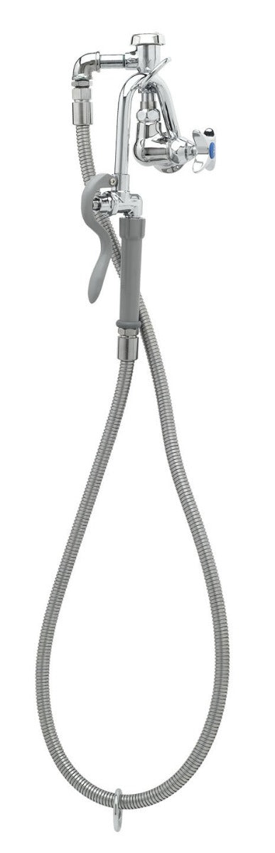 Pot & Kettle Filler Assembly, wall mount, 3-1/2" hook nozzle with self-closing valve, single 4-arm handle with blue index, Eterna cartridge with spring check, vacuum breaker, 68" flexible stainless steel hose, 4-arm handle & spray valve, hooked nozzle, 1/2" NPT female inlet, low lead content