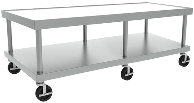 This mobile equipment stand is excellent for countertop equipment such as griddles and broilers. It is constructed from stainless steel with welded and smooth blended edges. The edges are 1/2" wide marine edges which help prevent spills from going over onto the floor. It has an undershelf for storage and (6) 5" casters (3 with brakes).