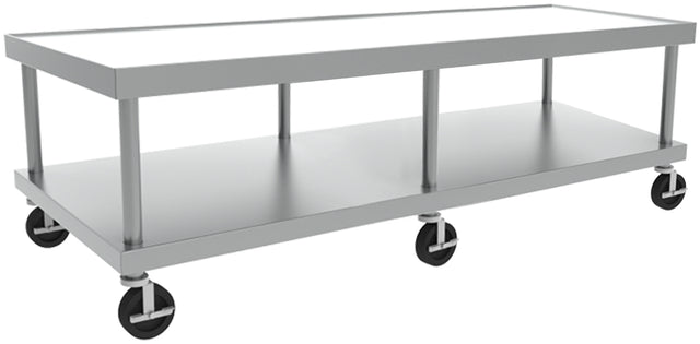 This mobile equipment stand is excellent for countertop equipment such as griddles and broilers. It is constructed from stainless steel with welded and smooth blended edges. The edges are 1/2" wide marine edges which help prevent spills from going over onto the floor. It has an undershelf for storage and (6) 5" casters (3 with brakes).