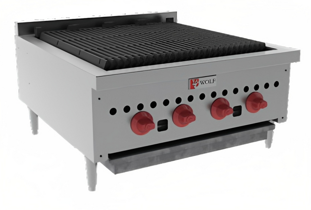 The SCB25CN-1 Wolf low-profile countertop model, gas charbroiler is one of our best options. It is constructed with stainless steel sides, control panel, top trim, backsplash, and grease trough. The cast iron char-radiants are heavy-duty with 5-1/4" wide, slopped cast iron, diamond grates. These grates are reversible for "level" broiling or self-cleaning. The pitched grease trough in each grate blade provides fat run-off and controls flare ups. It has four burners that are easily lit with the standing pilot ignition system. It includes supercharger burner dividers to minimize heat transfer to enhance multi-zone cooking capabilities. Each burner has one infinite heat valve. The valves have adjustment marks that are engraved into the front panel for easy set up. The underbar deflector system reflects heat upwards, creating a "Cool Zone" in the grease drawer which also facilitates easy cleaning at the end of the day.