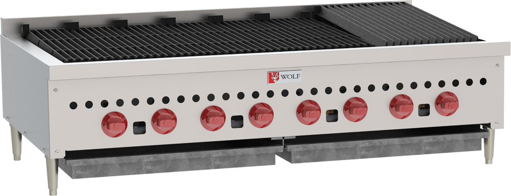The SCB47CN-1 Wolf low-profile countertop model, gas charbroiler is one of our best options. It is constructed with stainless steel sides, control panel, top trim, backsplash, and grease trough. The cast iron char-radiants are heavy-duty with 5-1/4" wide, slopped cast iron, diamond grates. These grates are reversible for "level" broiling or self-cleaning. The pitched grease trough in each grate blade provides fat run-off and controls flare ups. It has eight burners that are easily lit with the standing pilot ignition system. It includes supercharger burner dividers to minimize heat transfer to enhance multi-zone cooking capabilities. Each burner has one infinite heat valve. The valves have adjustment marks that are engraved into the front panel for easy set up. The underbar deflector system reflects heat upwards, creating a "Cool Zone" in the grease drawer which also facilitates easy cleaning at the end of the day.