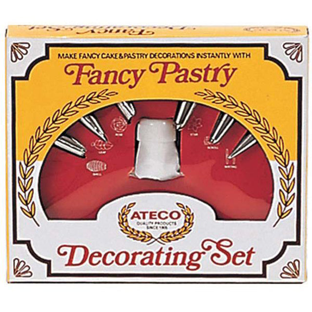 Ateco Decorating Cake Set, includes: (1) coupling & nut, (1) 10" flex bag, (6) assorted decorating tubes, recipes & trilingual instructions