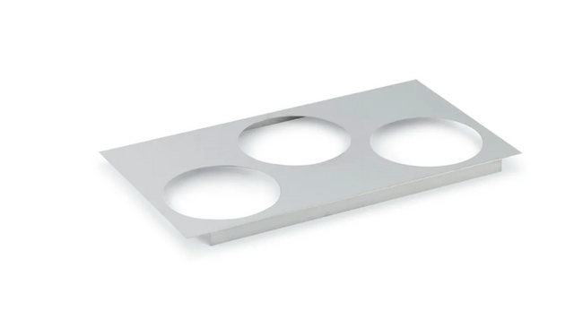 Compatible with a Cayenne Heat 'N Serve rethermalizer, the Vollrath 19188 adapter plate enables operators to serve out of 7-quart insets instead of third-size pans. This plate has three 8.37 inch-diameter holes and is made of durable stainless steel—a metal that streamlines cleaning. Overall, it measures 28 inches wide by 13 inches deep.