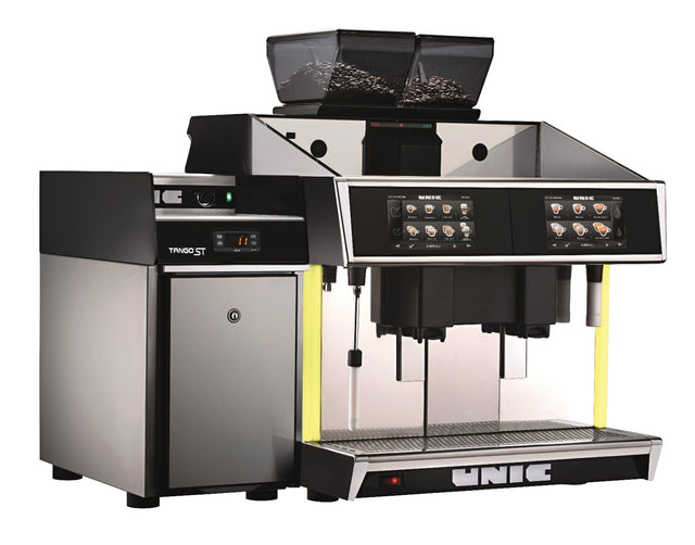 GRINDMASTER Beverage - (LV602939) UNIC Tango ST Duo Milk Espresso Machine (MILK REFRIGERATOR NOT INCLUDED - PLEASE SELECT FROM REFRIGERATOR OPTIONS BELOW), 2 group, super automatic, 1-step, with automated in-the-cup milk drink delivery, with SteamAir wand, automated milk foamer, upward of 48 lbs/week capacity, (2) 6.5 liters each boiler capacity, (2) 3.75 lbs each bean hopper capacity, (2) grinders with 80mm Mahlkonig burrs, (2) 60,000 cycle piston seals, (2) independent stainless steel brewing chambers, (48) programmable & customizable icon recipes, touch screen display, (9) infusion parameters, temperature regulation for steam, coffee, & group, independent steam & coffee boilers, (2) telescopic dismountable double coffee spouts, telescopic programmable hot water dispenser, large waste bin with overfill safeguard, day/night mode, drink counter, cup warmer, full sized rotary vane pump, stainless steel panels & steel framework, includes: (2) additional milk foam dispenser for cleaning cycles, (100) cleaning tablets, (120) Rinza Milk Cleaner Tablets, (1) tube Superlube, technician & operator control cards, USB card, plumbing tubes for water (3/8" NPT) & drain line, adjustable LED lighting, 208v/60/1-ph, 6120 watts, 30 amps, (plug not included), cCSAus, NSF