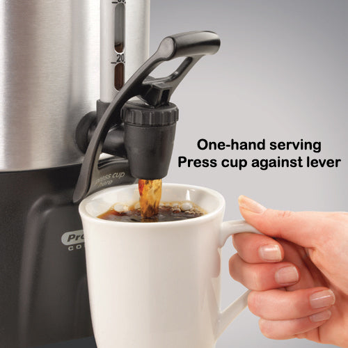 The Proctor-Silex Aluminum Coffee Urn features dual heaters for brewing and gentle warming for fast, cup a minute brewing. Brew anywhere from 20 to 100 cups of hot, fresh coffee. The ready-to-serve light will notify you and your customers when the coffee is ready for service. Gusts will appreciate a cup-activated dispenser that makes it easy to fill cups one-handed, perfect for guests juggling plates at the end of a buffet line.