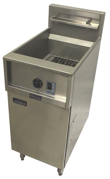 One popular option is the Economy E35 electric floor fryer designed by Pitco, with thermostatic controls. This whole unit is easy to operate, and will provide you with large amounts of goodies to serve your customers. The tank, front, door, sides, and side splashes, are all constructed of stainless-steel and it stands on 6" adjustable legs. A set of twin fry baskets per fry pot is included. Then when you're not cooking, you can put those baskets up on the basket hanger. The basket hanger is removable.