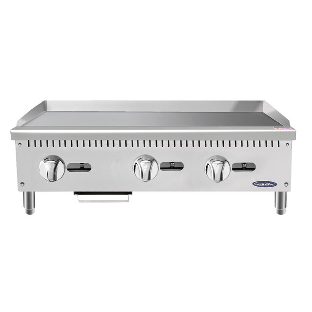 CookRite Heavy Duty Griddle, gas, countertop, 36"W x 28-3/5"D x 15-1/5"H, (35-7/10"W x 19-9/10"D cooking area), 3/4" thick griddle plate, (3) stainless steel burners, standby pilots, independent manual controls, stainless steel structure, adjustable stainless steel legs, 90,000 total BTU's, cETLus, ETL-Sanitation
