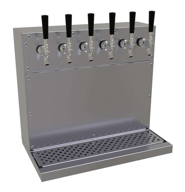 Draft Dispensing Tower, wall mount, 20"W x 18"H, air-cooled, (6) stainless steel faucets (handles not included), 11-1/4" faucet clearance, integral drain pan with removable perforated insert & 1/2" tailpiece, 1/4" stainless steel shanks with 3/16" restriction lines, built-in mounting bracket, removable front cover, stainless steel construction, ETL-Sanitation (NOTE: Made to order, not returnable)