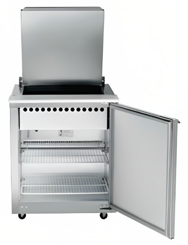 Traulsen UST279-R-SB 1-Section Right Hinged 1 Door Refrigerated Salad/Sandwich Prep Table with Low Profile Flat Lid & Stainless Steel Back 27" - Holds (9) 1/6 Size Pans - 7.7 cu. ft. - 115v