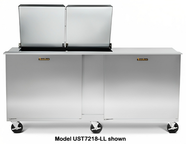 The UST7212-RR from Traulsen is one of most popular and efficient products. The exterior is constructed using stainless steel and the interior uses anodized aluminum. It has 2" thick, high density, non-CFC, foamed in place polyurethane insulation located throughout the cabinet and doors. A roll-top lid that can serve as an over shelf is included. The doors include both a self closing and stay open mechanism. Each model is supplied with a full complement of 4" deep, plastic, 1/6 size pans and dividers. This prep table exclusively comes with the ability to hold 6" deep top pans and keep them at a safe and nice temperature for your customers. A 12" deep, full-length, reversible white nylon cutting board is also included.