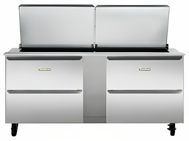The UST7230-DD-SB from Traulsen is one of most popular and efficient products. The exterior and back is constructed using stainless steel and the interior uses anodized aluminum. It has 2" thick, high density, non-CFC, foamed in place polyurethane insulation located throughout the cabinet and doors. A roll-top lid that can serve as an over shelf is included. The four drawers include both a self closing and stay open mechanism. Each model is supplied with a full complement of 4" deep, plastic, 1/6 size pans and dividers. This prep table exclusively comes with the ability to hold 6" deep top pans and keep them at a safe and nice temperature for your customers. A 12" deep, full-length, reversible white nylon cutting board is also included.
