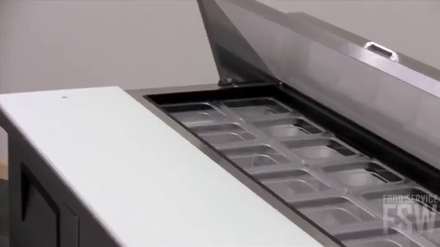 This fits 18 standard, clear poly-carbonate food pans in the counter-top prep area. The pan opening is designed to fit various sizes of pan configurations with pan divider bars, however, varying size pans are sold separately. In order to keep your food cold each food pan has a stainless-steel, patented, foamed insulated lid and hood to lock in freshness and minimize condensation. Another perk of this unit, is the full length, white polyethylene, removable cutting board.