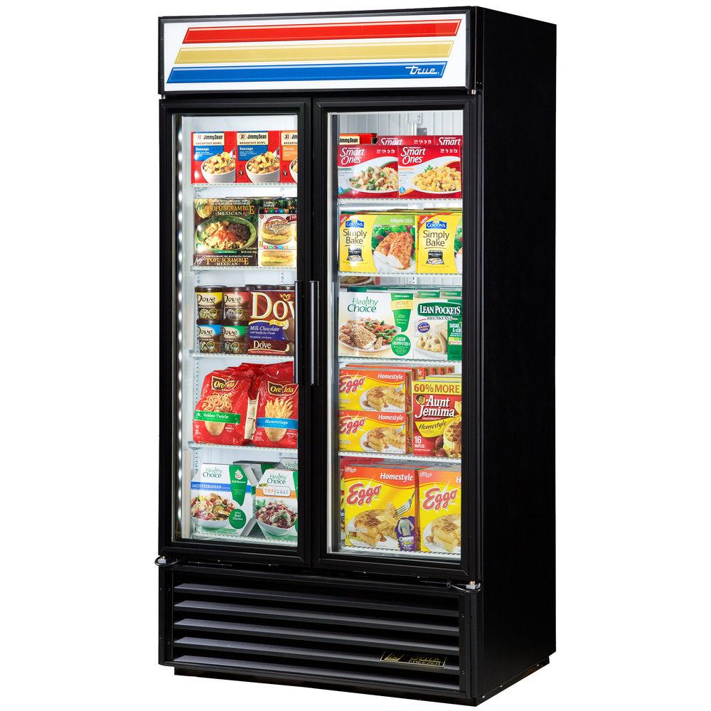 One wonderful option is the True GDM-35F-HC~TSL01 freezer merchandiser with LED lighting and two swinging glass doors. It is energy efficient in keeping its contents cold due to the foamed-in place, high density, polyurethane insulation that keeps the entire cabinet from losing heat. The top of the unit features an illuminated sign panel that has a variety of customization options for you to choose from. The exterior features non-peel or chip white laminated vinyl which is durable and permanent. The interior includes an NSF approved, clear coated aluminum liner and stainless steel floor. The floor was designed to prevent the danger of harmful bacteria that will reside at its bottom from accumulating.