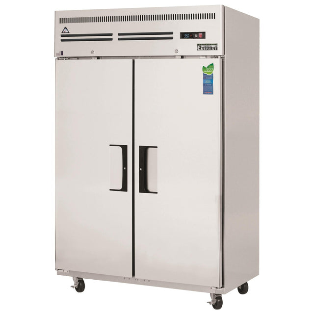 Reach-In Refrigerator, two-section, 49-5/8"W, 48.0 cu. ft. capacity, self-contained top mounted refrigeration, (2) solid hinged self-closing field reversible doors (locking), (6) epoxy coated wire shelves, height adjustable clips, digital controls with LED display, auto defrost, LED interior lighting, pressure relief port, stainless steel interior, stainless steel sides, galvanized steel top, bottom & rear, (4) 5" swivel casters (2 locking), R290 Hydrocarbon refrigerant, 1/4 HP, 115v/60/1-ph, 3.8 amps, cord, NEMA 5-15P, NSF, cETLus, ETL-Sanitation, ENERGY STAR